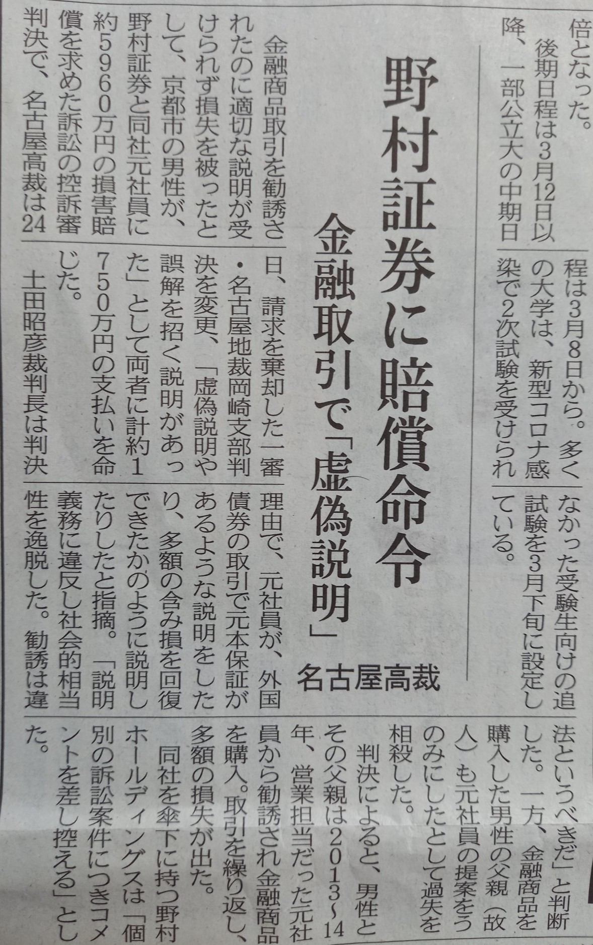 小職が獲得した野村証券に対する名古屋高裁逆転勝訴判決について、2月25日付け日本経済新聞夕刊と翌26日付け毎日新聞朝刊でも報道されました。